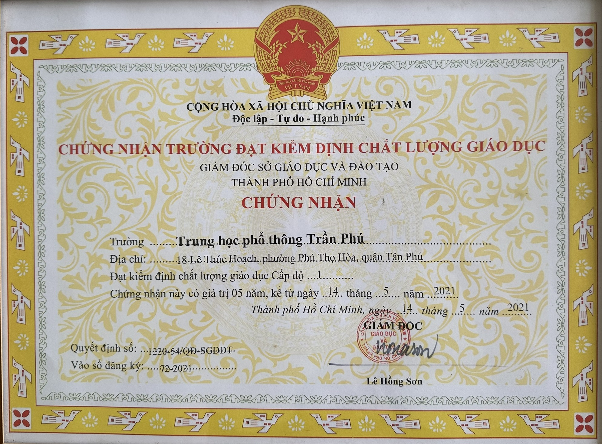 Chứng nhận kiểm định chất lượng giáo dục Cấp độ 1 - Năm 2021